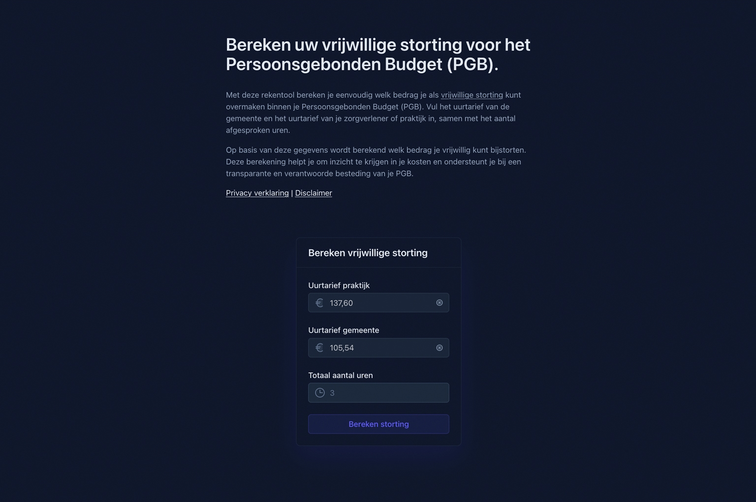 Met deze rekentool bereken je eenvoudig welk bedrag je als vrijwillige storting kunt overmaken binnen je Persoonsgebonden Budget (PGB).